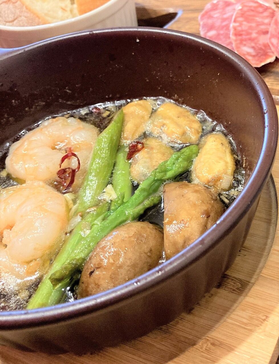 海鮮と野菜のアヒージョ バゲット付 1500円(税込)。