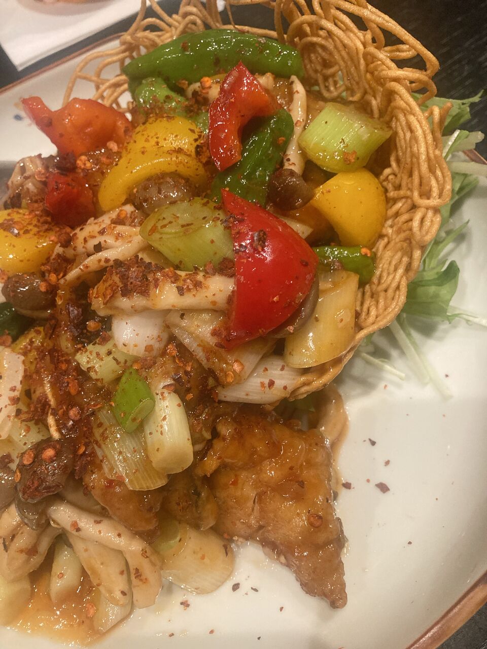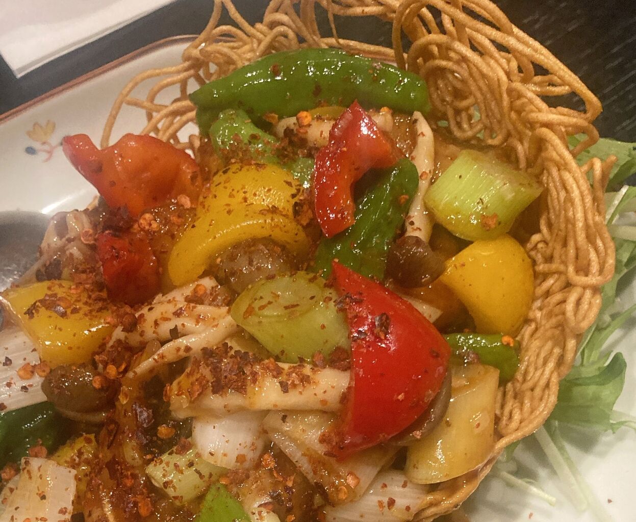 揚げた麺が皿みたくなっていて、