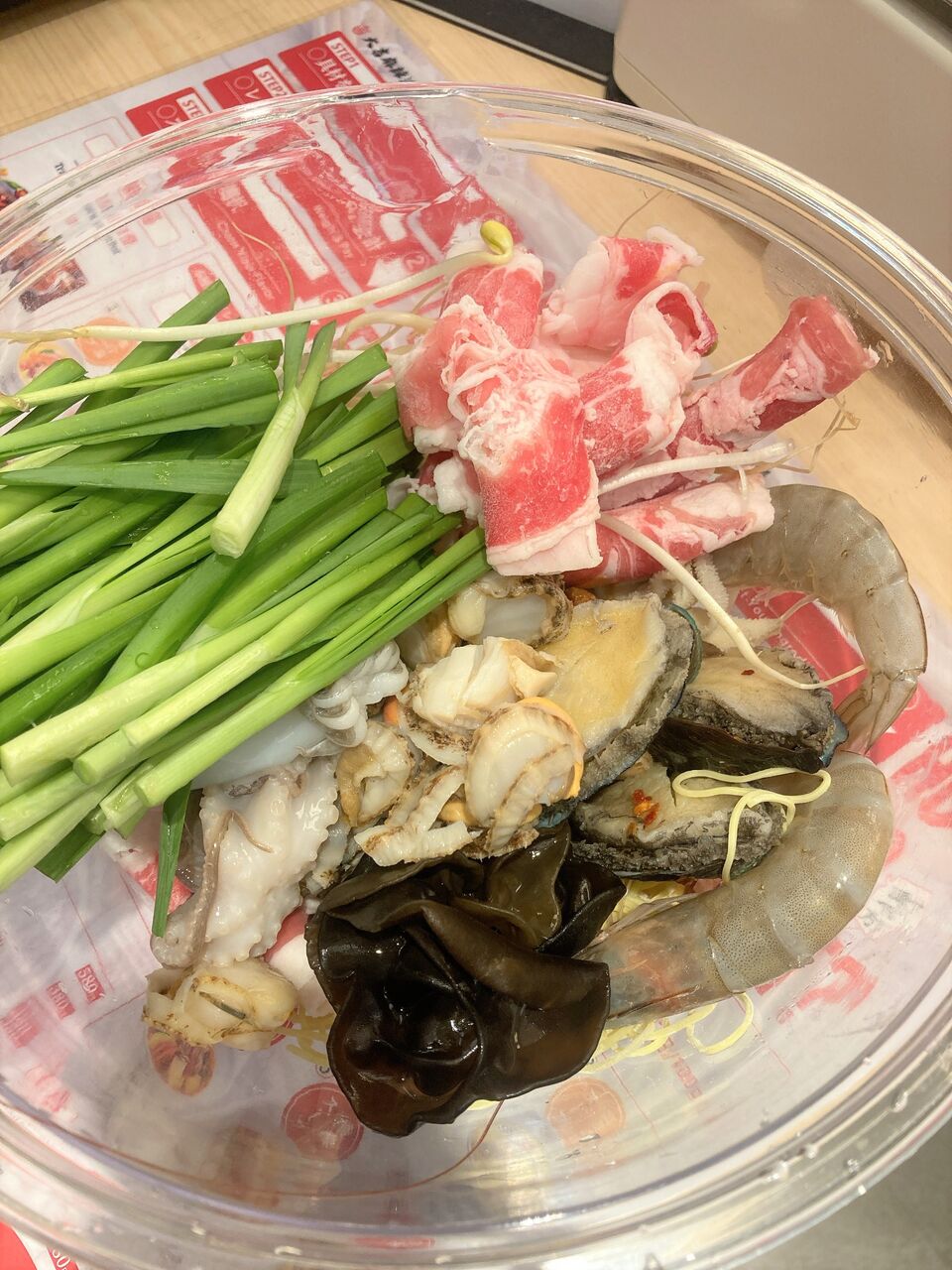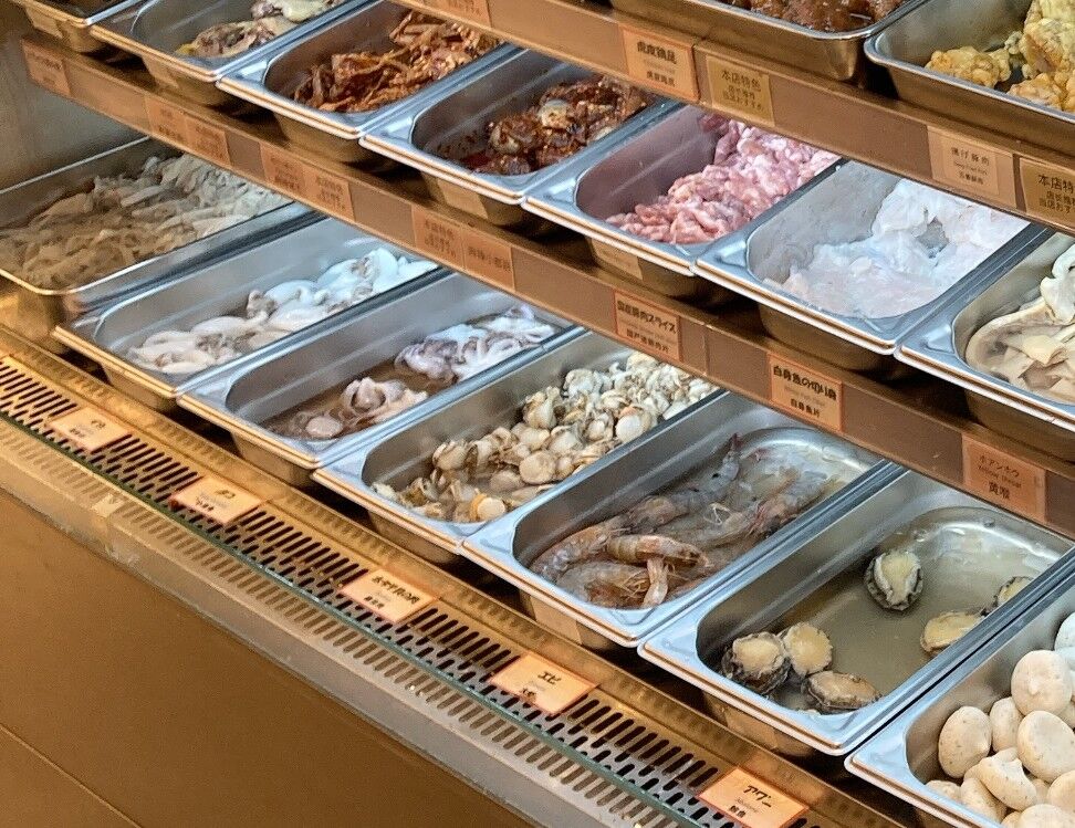 アワビ、エビ、イカ、ベビーホタテ、ラム、牛、豚、
