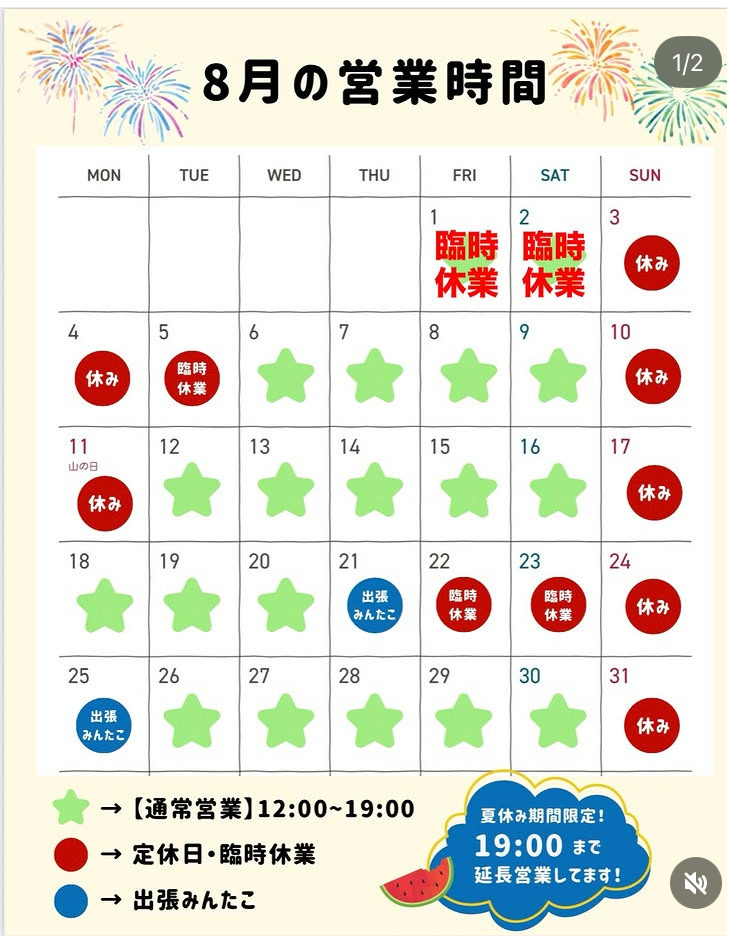8月の営業カレンダー。
