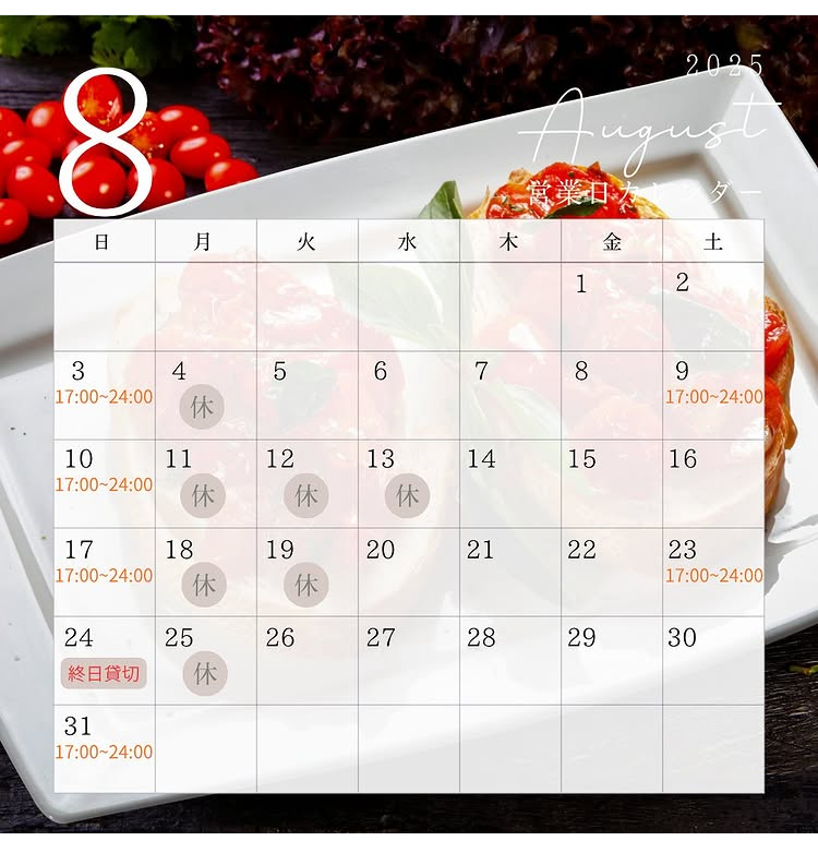8月の営業カレンダー。