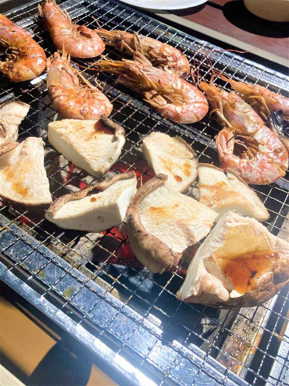 秋も近いし、王様しいたけや海老を焼いて。