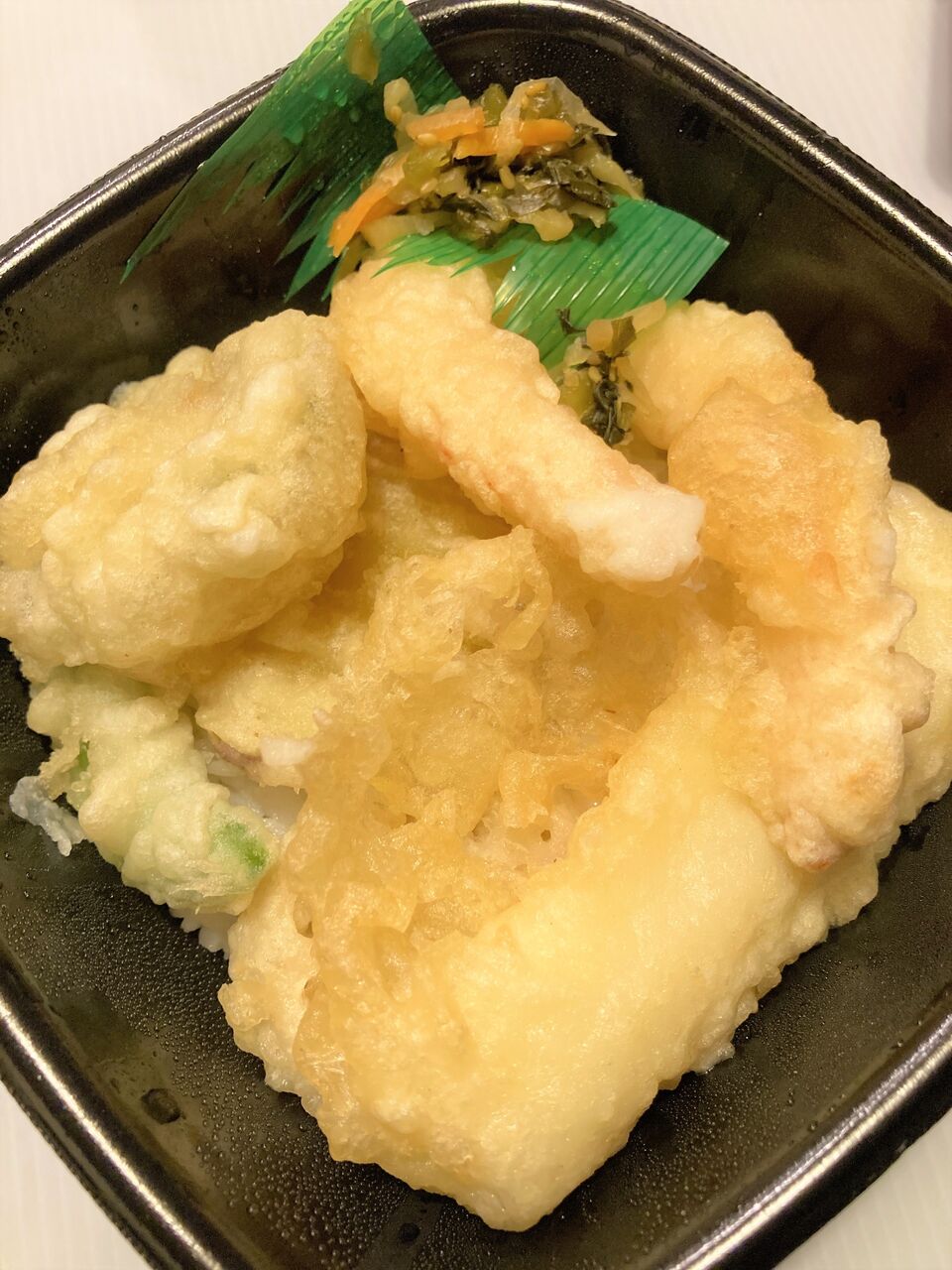 エビ2尾、イカ、カレイ、野菜3種からなる海鮮天丼。