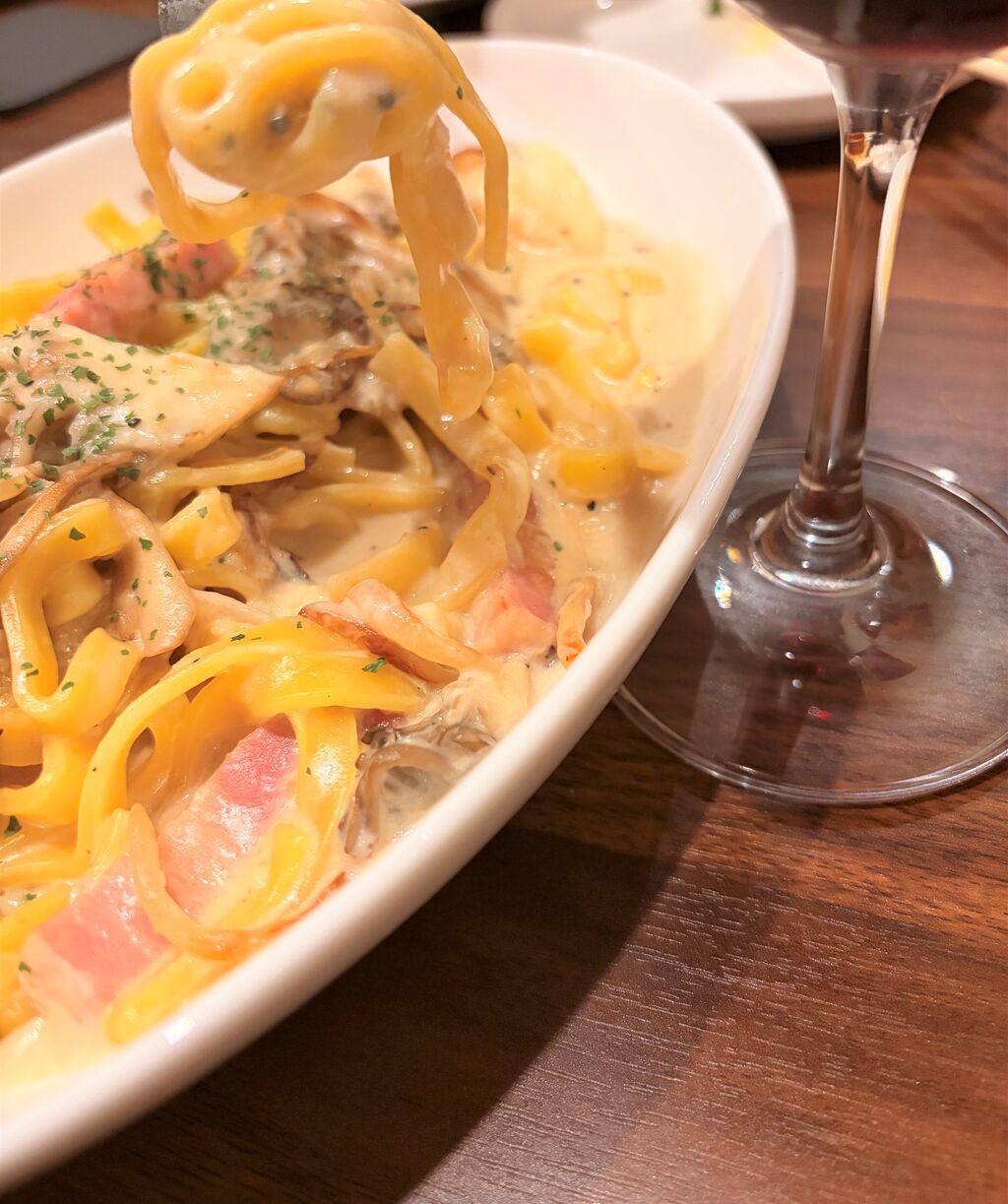 舞茸とベーコンのクリームパスタ 1430円(税込)。