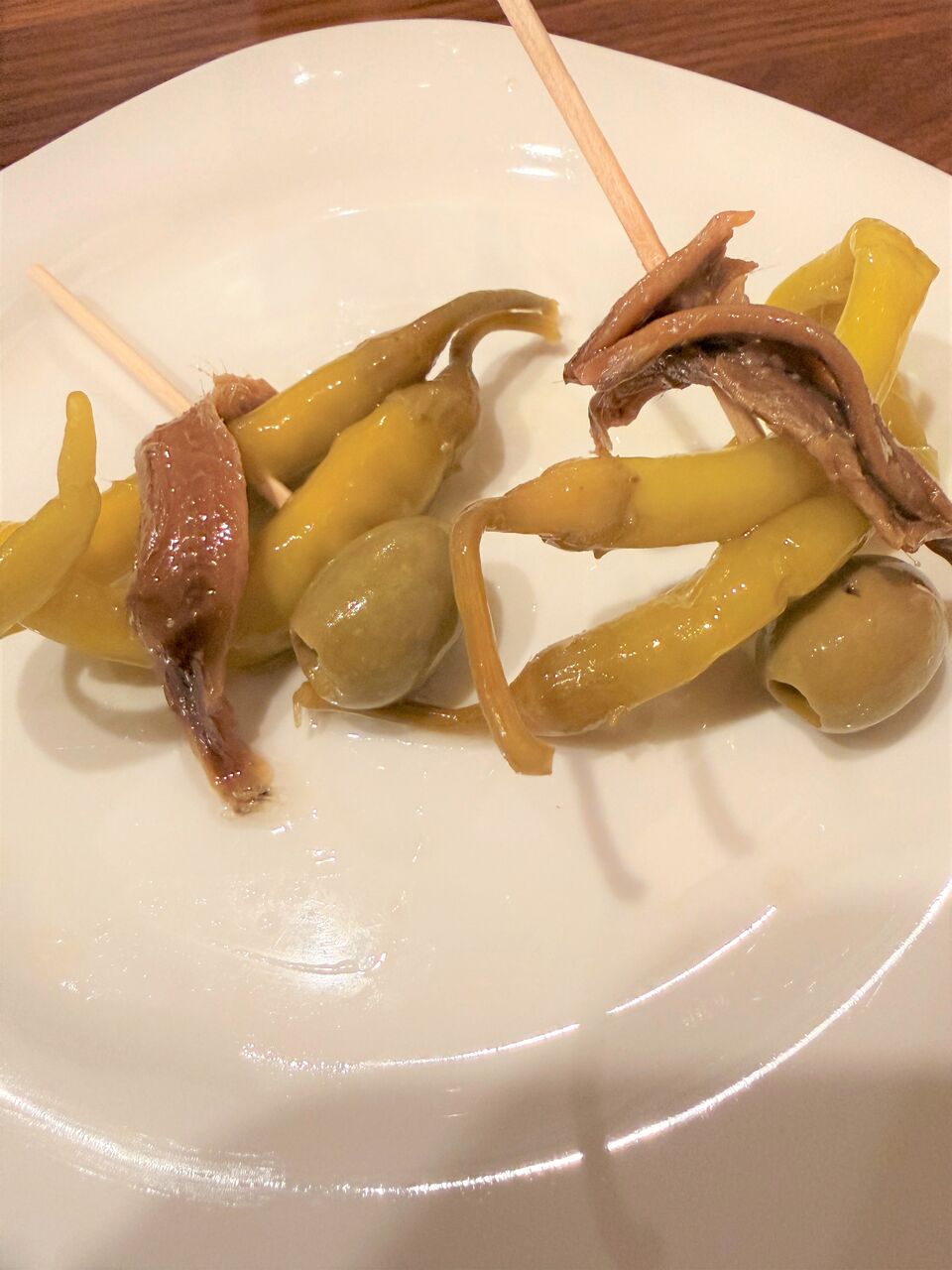 青唐辛子の酢漬け、アンチョビ、オリーブが串に。
