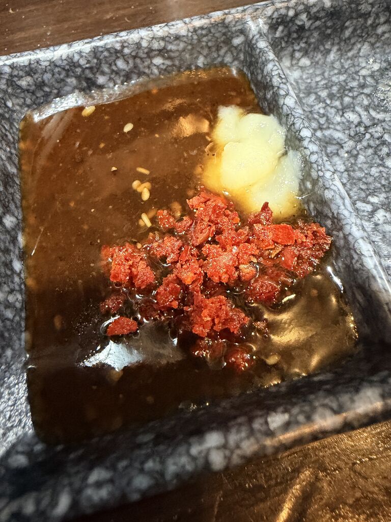 タレやにんにくはテーブルにあるが、